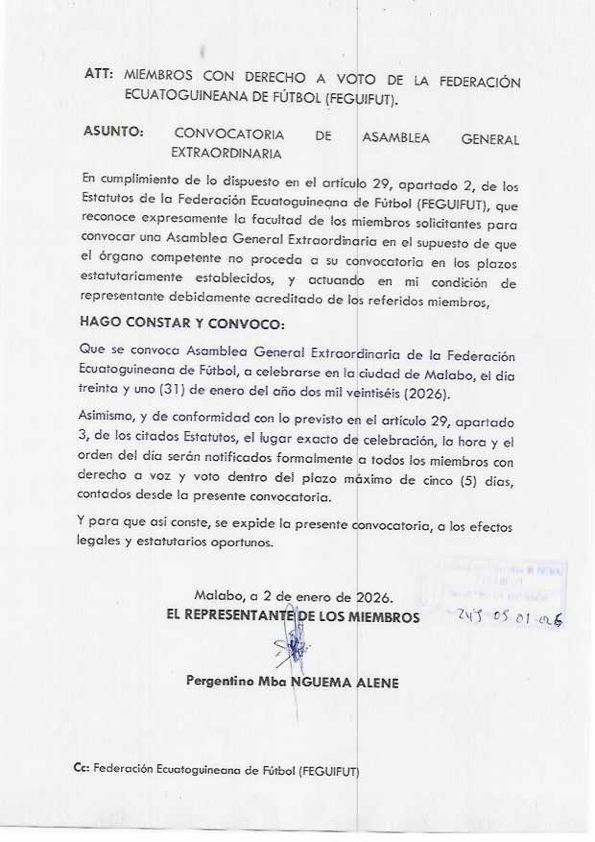Último episodio hasta la fecha: el Sr. MBA NGUEMA ALENE se arroga el estatus de «representante» de ciertos miembros con derecho a voto para convocar una asamblea general extraordinaria de la FEGUIFUT. Sin embargo, no se ha presentado ninguna autorización notarial que justifique dicha representación, la cual, además, no está prevista en los estatutos de la federación. Una iniciativa percibida por numerosos observadores como un intento de imposición institucional.