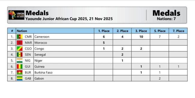 Dès l’entame du tournoi, les judokas camerounais ont démontré une performance éclatante, s’adjugeant la première place du classement des médailles dans la catégorie junior. La nation hôte a réalisé une moisson impressionnante, récoltant 20 médailles au total. Cette domination sans partage est matérialisée par six {06} médailles d’or, quatre {04} médailles d’argent et dix {10} médailles de bronze, plaçant le Cameroun largement en tête, un exploit salué par la fédération et le public. Des athlètes comme Fiona NSAME MBONGO, Valdadine TSAFACK et Michel Prince DZUKOU figurent parmi les principaux artisans de ce succès retentissant.